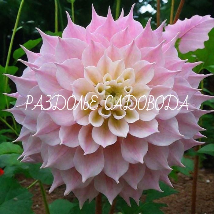 Изысканный сорт георгина с крупными соцветиями нежно-розового оттенка и безупречной декоративной формой. Широкие лепестки расположены в несколько рядов, создавая пышную розетку с легким градиентом — от насыщенного розового в центре до почти белого по краям. Куст мощный, с прочными стеблями и густой тёмно-зелёной листвой.