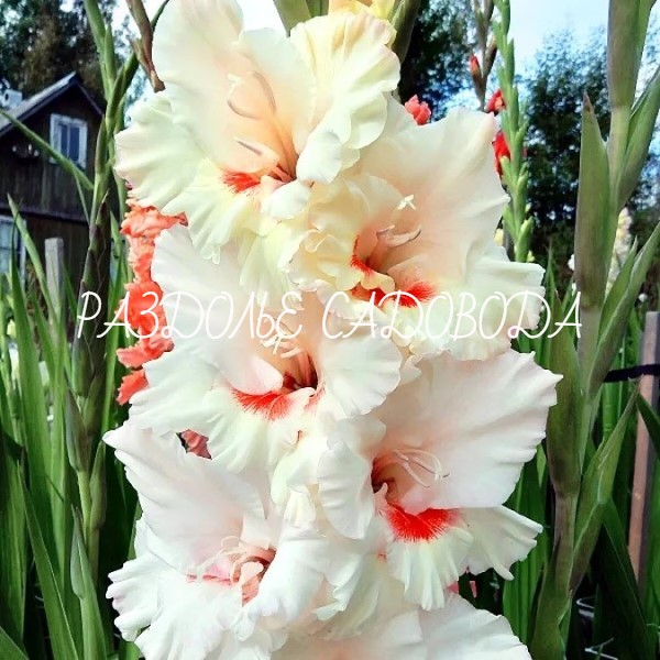Оригинальная окраска, которой отличается гладиолус Аякс, позволит создать интересный акцент в Вашем саду. Посадив луковицы гладиолуса Ajax, ждите в июле красавцев высотой около 1-го метра с рыхлыми двурядными соцветиями, где в одновременном роспуске может быть 8-10 цветков. Цветки достаточно крупные, диаметр 14-16 см. Лепестки молочно-белые, на нижнем есть ярко-алые мазки. В цветнике гладиолус Аякс прекрасно смотрится рядом с белыми и красными сортами.