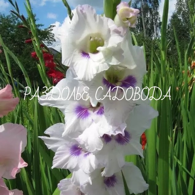 Очень красивый и нежный сорт! Эффектный гладиолус белого цвета с небольшими фиолетовыми пятнами на нижних лепестках. По краям цветки слегка гофрированные, что придаёт им дополнительное изящество.