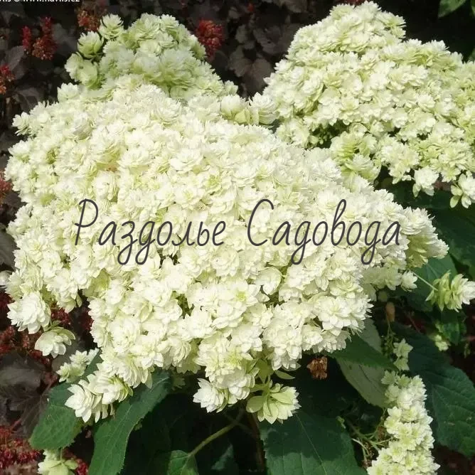 Дабл Аннабель отличается махровыми цветками, похожими на звездочки. Они собраны в шаровидные плотные соцветия белого цвета, 25 см.