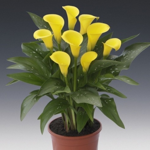 Растение имеет яркие лимонные цветки с желтым початком посередине.