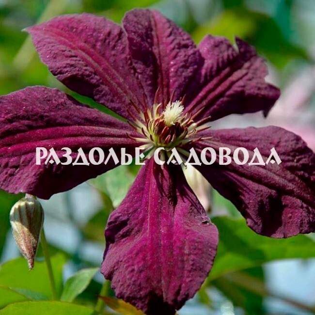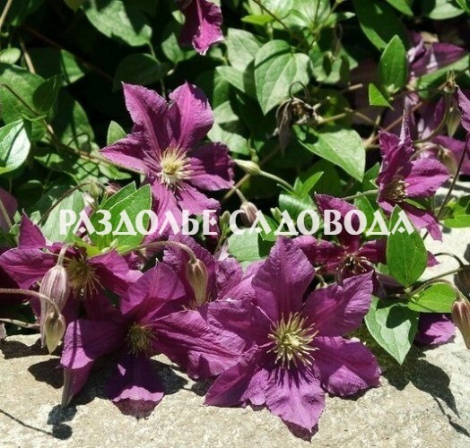 Цветки раскрытые, крестообразные, 10-14см в диаметре. Лепестки меняют свой окрас от степени освещенности и возраста цветка, от тёмно-фиолетового до лилово-пурпурного, лепестки бархатистые, 5-6-ти лепестковые, пыльники тёмно-вишнёвые.