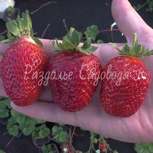 Плоды крупные 30-50 гр.( к концу сезона могут становиться помельче), овальной или трапециевидной формы, с плотной мякотью без пустот. Кожица ярко-красного цвета. Вкус приятный, сладкий, с легкой кислинкой. Ягодки устойчивы к транспортировке и имеют привлекательный товарный вид.