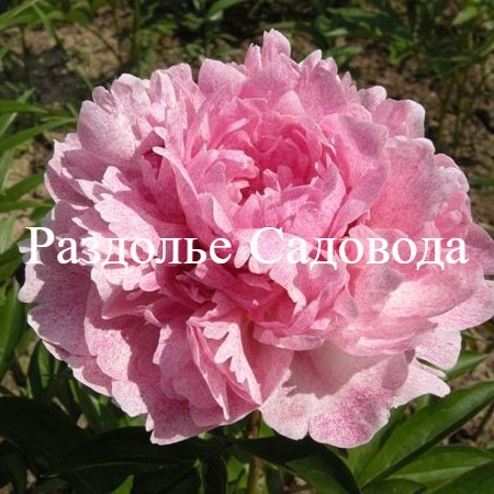 Цветок пиона имеет махровую розовидную форму и размер около 16 см в диаметре. Окраска лепестков нежно-розовая, а по всей поверхности распределены более темные точки, которые создают россыпь на цветке.